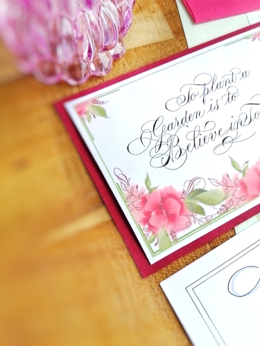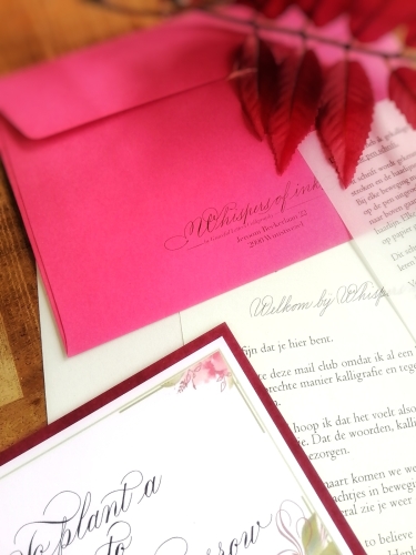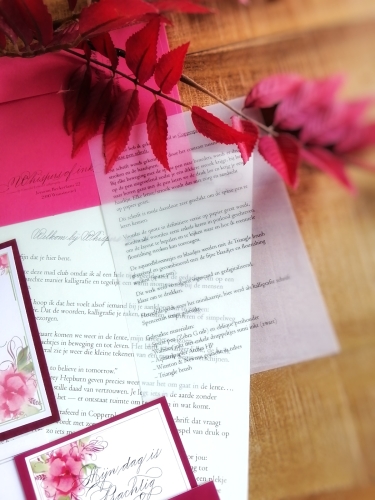 'Whispers of ink' is een maandelijks abonnement (eenvoudig opzegbaar) waarbij je elke maand een zorgvuldig geschreven brief, kalligrafisch werkstuk (A6 kaart), een mini kaartje en een kaart om zelf mee aan de slag te gaan, ontvangt.